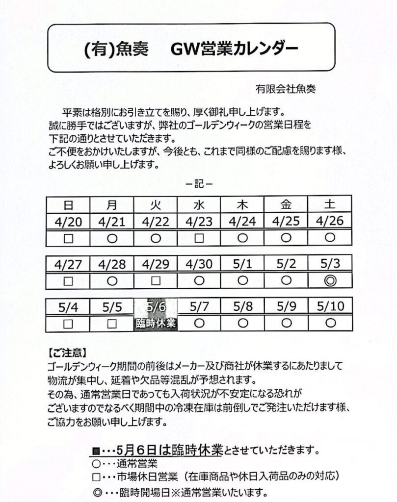 ゴールデンウィーク期間中の配送スケジュールは以下の通りとなっております。